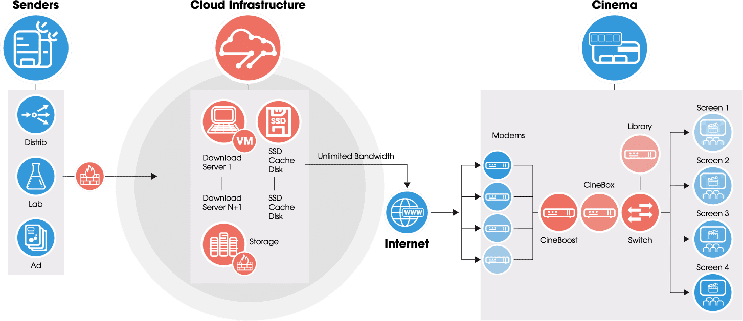 Que vous soyez un cinéma ou un distributeur de films, profitez de la transition numérique et simplifiez l’acheminement de vos contenus DCP vers les salles de projection. Globecast offre un service de qualité pour transférer vos contenus numériques de manière fiable, rapide et efficace, en commençant par le déploiement sur site de notre Cinebox, jusqu’au suivi de tous vos transferts.