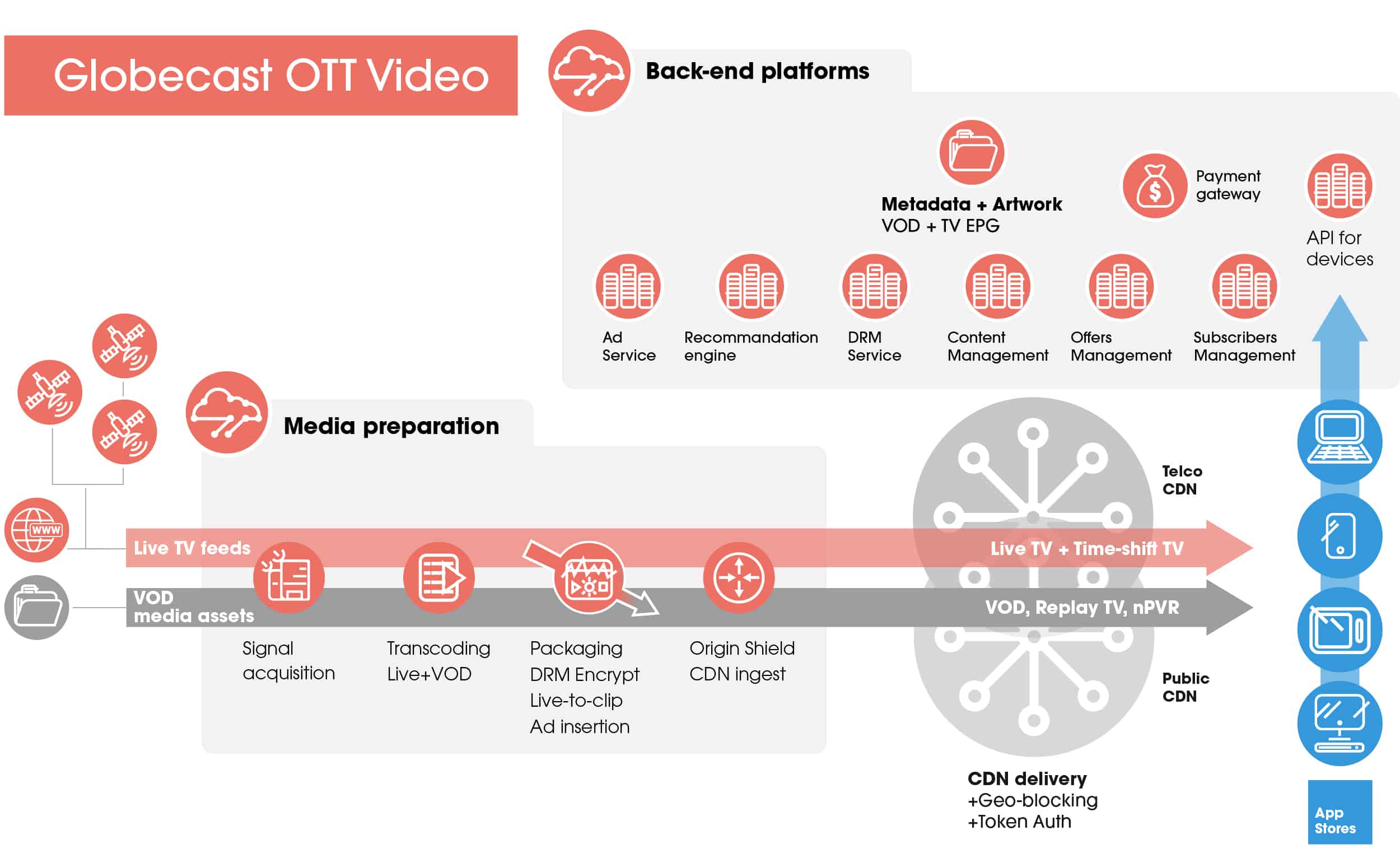 Globecast provides a comprehensive OTT Video service management platform, featuring advanced video preparation and delivery infrastructure, as well as integration with your existing or upcoming websites and applications, all within a secure hybrid cloud environment.